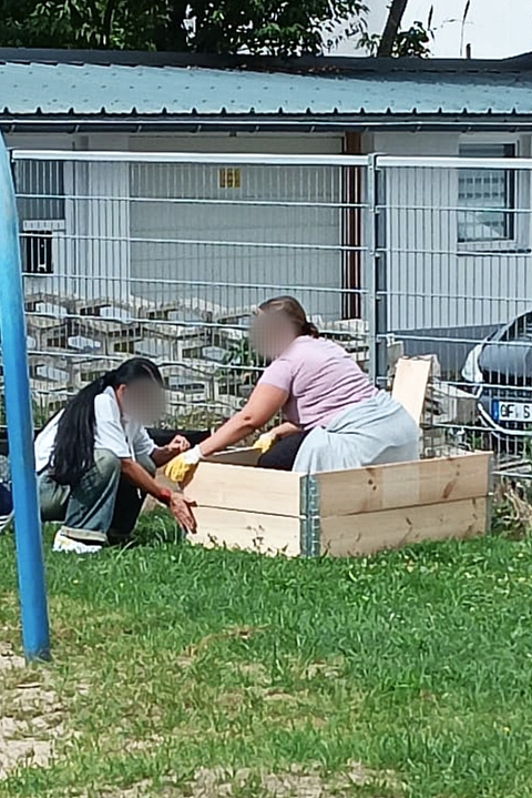 Neue Hochbeete wurden aufgebaut und bepflanzt, zwei Pflanzpyramiden setzen frische grüne Akzente und mehrere Pflanzkübel bereichern das Gelände. Auch eine Wetterstation fand ihren Platz – ein spannendes Werkzeug, mit dem die Kinder Wetter und Natur hautnah beobachten können.